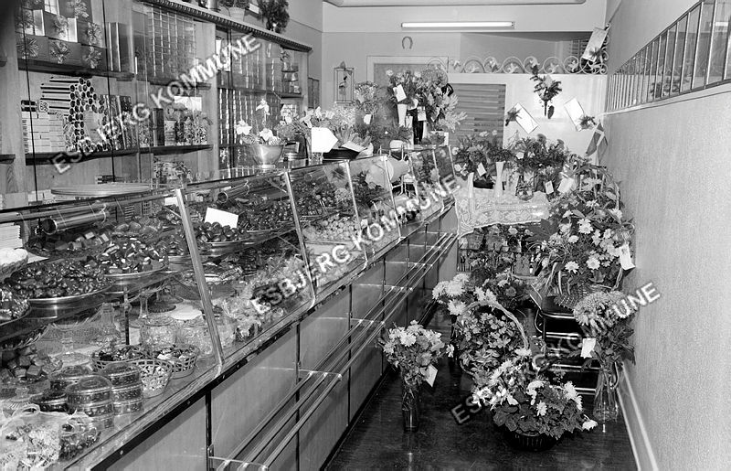 Format: jpeg Title: Blomster i Christine Jørgensens konfektureforretning i Kongensgade 43 i forbindelse med forretningens 50-års jubilæum. Forretningen var på dette tidspunkt drevet af Kis Bang Knudsen dec. 1959 kilde: http:/billedarkiv.esbjergkommune.dk